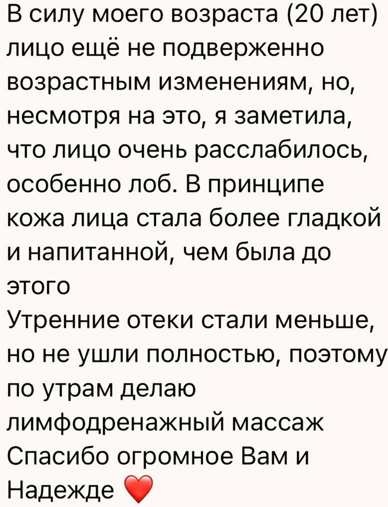 Урок представляет собой: видеоурок (30 мин) с уникальными техниками по самоостеопатии для лица. Вопросы по уроку вы сможете задавать в чат поддержки. Выполнять урок необходимо 1-2 р в неделю до достижения видимого эффекта.